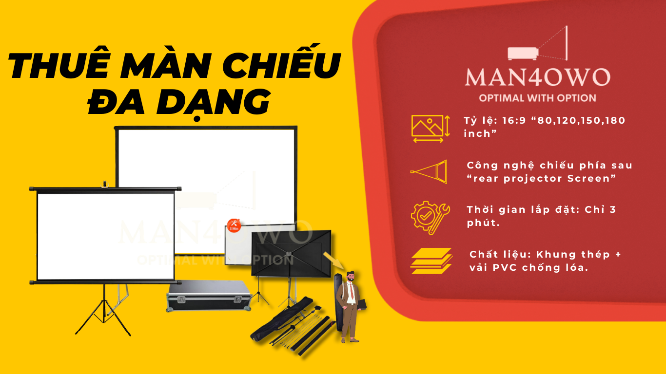 Man4OwO tự hào mang đến giải pháp trình chiếu toàn diện với hệ thống cho thuê màn chiếu đa dạng, hỗ trợ cả công nghệ chiếu trước (Front Projection) và chiếu sau (Rear Projection). Chúng tôi cam kết chất lượng hình ảnh vượt trội cho mọi không gian trình chiếu!